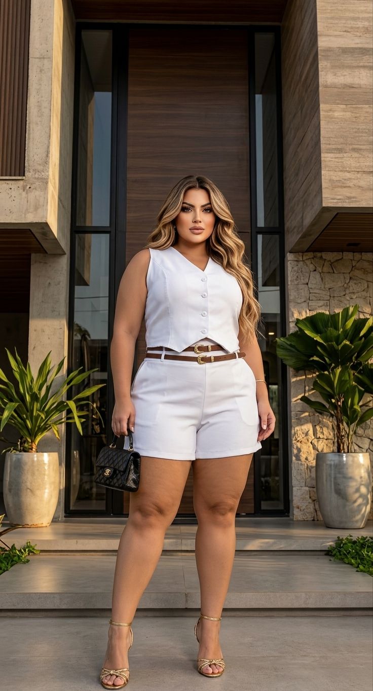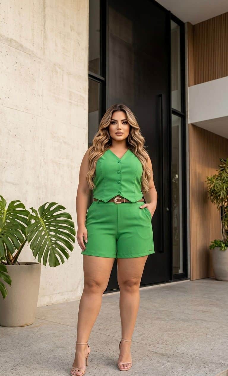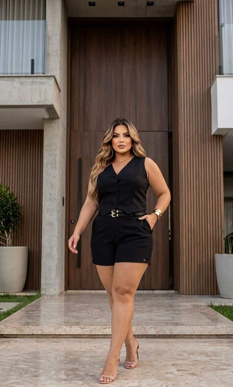 Conjunto Jousy Feminino Alfaiataria com Elastano Colete e Short Cintura Alta Elegante